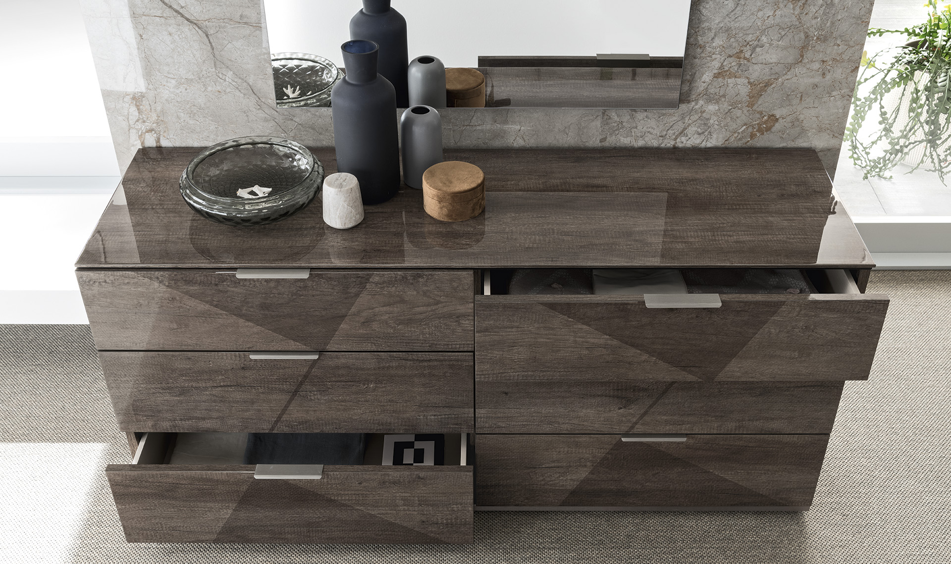 AL. FAV olasz dizájn komód öt ill. hat fiókkal, kétféle változatban. A FAV hálószoba kollekció része, melynek kifinomult és praktikus kínálatával könnyedén és igényesen felszerelhetők a hálóhelyiségek. A természetes megjelenésű tölgyfa felületekkel készült komód további esztétikus és nagy méretű tárolóhelyekkel bővítheti otthonát.