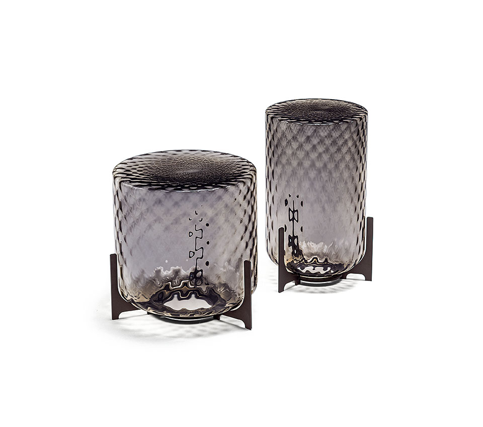 A Dodo fúvott üveg dohányzóasztal a híres Balloton technikával készül, amely a muranói üvegmesterek hagyományainak egyik meghatározó eleme. A Dodo üveg dohányzóasztal teste egyedi, háromdimenziós, keresztezett rombuszmintával rendelkezik, amelyet egy speciális fémöntőforma segítségével alakítanak ki. Az üvegfújás során az öntőforma belső csúcsai formálják a megolvadt üveget, létrehozva a Balloton technika jellegzetes fazettázott felületét. Az asztallap felső részén egy mandala-minta jelenik meg, amely kissé excentrikusan helyezkedik el, ott, ahol az öntőforma rombuszai találkoznak. Ez a kialakítás virágszirmokra emlékeztet, vagy a buddhista tradíciókban megjelenő tökéletes mintázatokra, amelyek a természet lenyűgöző szépségét fejezik ki. Az optikai hatás különösen látványos, amit tovább fokoz a füstszínű kristály lila árnyalata. A fény csodálatos módon játszik a szabályos mintákon, lágy és kifinomult vizuális hatást keltve. A dohányzóasztal három élesen megformált lába kontrasztot alkot a lekerekített, lágy üvegtesttel. Ez a dizájnelem a retró stílus és a kortárs formatervezés tökéletes kombinációját hozza létre. A Dodo dohányzóasztal a kézműves üvegművesség egyik csúcspéldája, amely egyszerre modern és időtlenül elegáns.