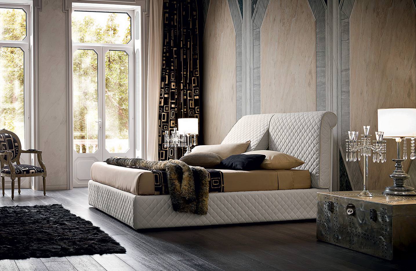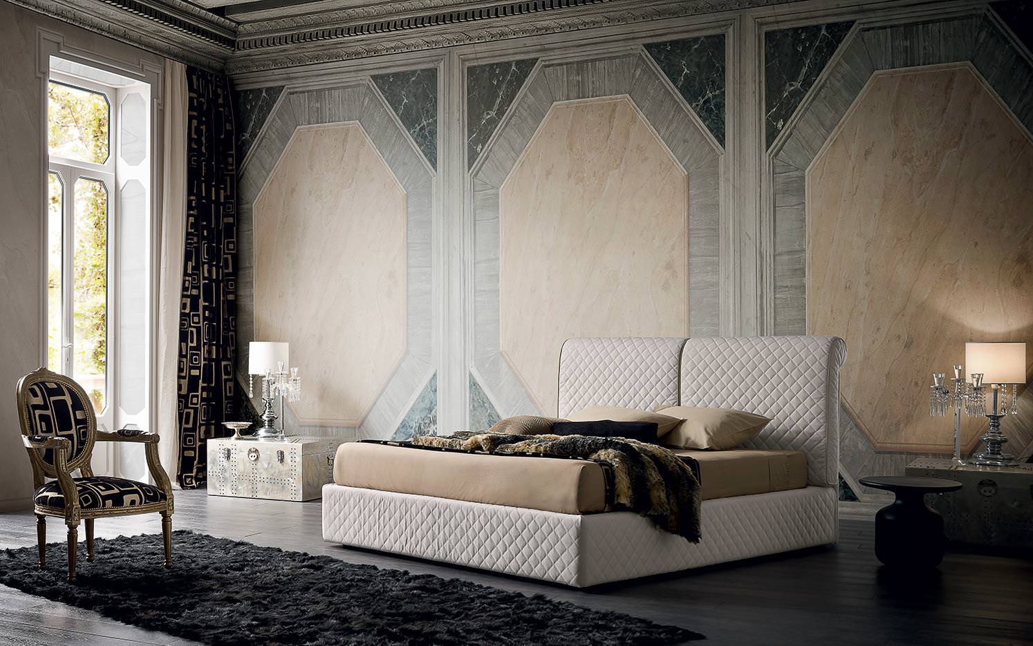 Nagy térfogatú bolyhos párnákkal felszerelt olasz dizájn ágy, elegáns rombusz mintázatú öltésekkel. Komfortos és