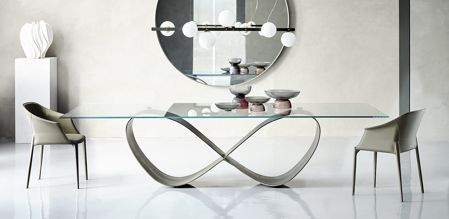 Cat. Butterfly étkezőasztal. Olasz dizájn asztal 15mm extra tisztaságú üveg asztallappal, lakkozott acél lábszerkezettel. Többféle méretben bevonattal elérhető, amelyhez számos további stílusban hozzáillő termék is választható.
