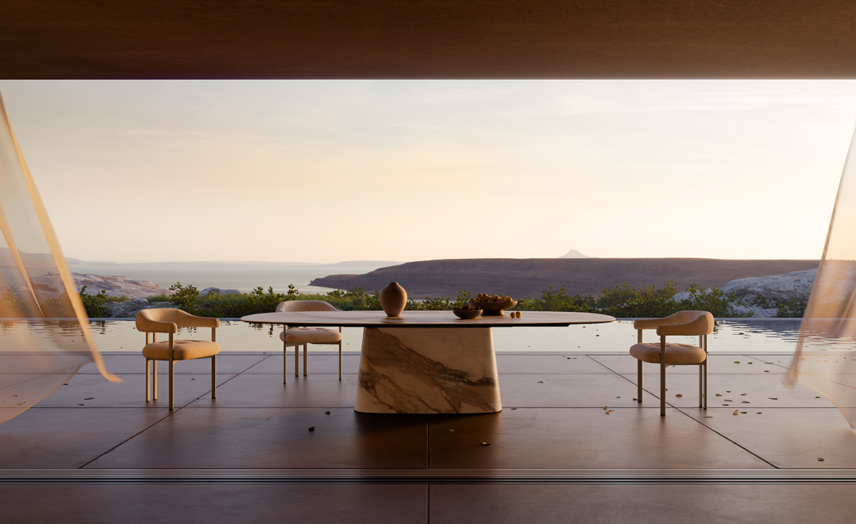 A Napoleon Outdoor modell központi talpa két szimmetrikus, ívelt elem találkozásából épül fel, amelyek szoborszerű stabilitást és karaktert adnak az asztalnak. A talp egyik oldalán kialakított süllyesztett, függőleges kerámiahorony finoman megtöri a homogén felületet, dinamikus részletet csempészve a letisztult formába. Ez az apró, mégis markáns designmegoldás a modern esztétika egyik meghatározó eleme.