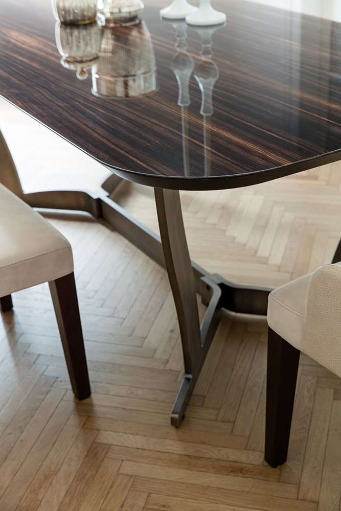 Alb. Humphrey olasz dizájn étkezőasztal. Modern fixasztal melynek tömör ébenfából készült asztallapja fém tartószerkezettel párosul. Az elegáns formatervezésű modell ugyanolyan könnyedén illeszkedik klasszikus stílusú berendezésekbe mint a modernebb hangulatú helyiségekbe.