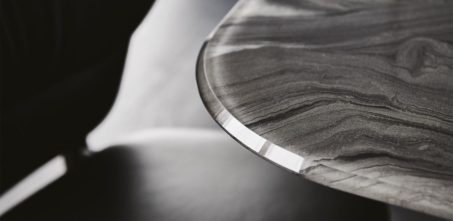 Szögletes, vagy lekerekített sarkú asztallap, művészi mintázatú 12 mm vastag extra tisztaságú üvegből készítve. A lábak titán, grafit, vagy fekete lakkozott acél változatban kaphatók.