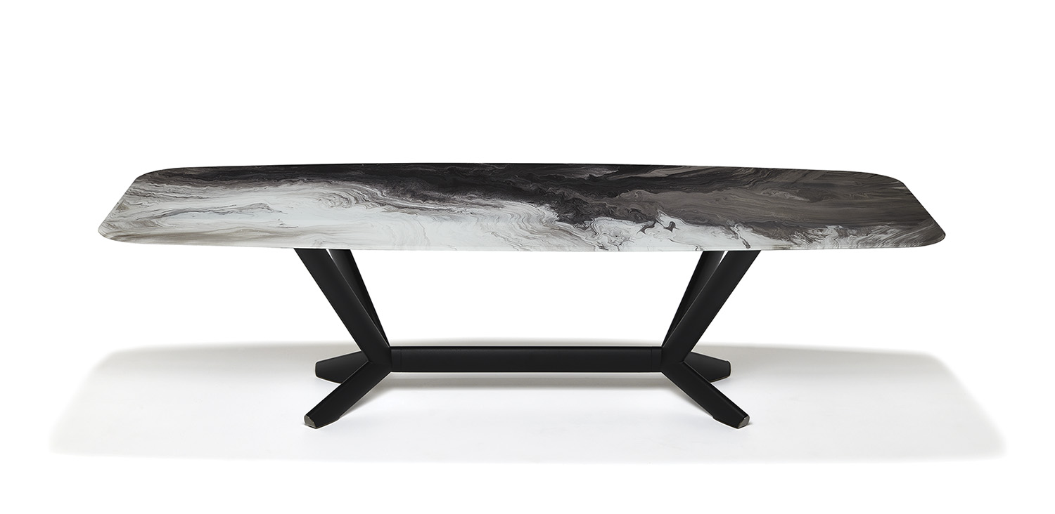 Szögletes, vagy lekerekített sarkú asztallap, művészi mintázatú 12 mm vastag extra tisztaságú üvegből készítve. A lábak titán, grafit, vagy fekete lakkozott acél változatban kaphatók.