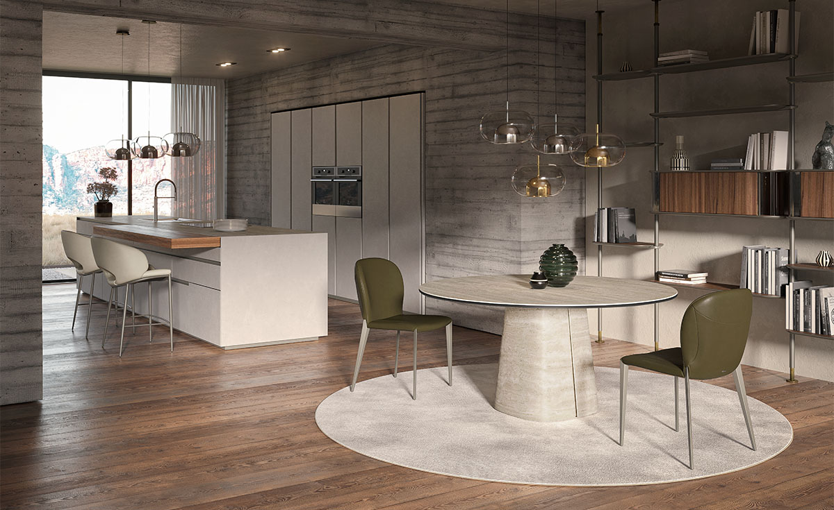 A Rado Keramik Round központi talpa innovatív, ívelt kerámia technológiával készült, amely új dimenziót ad a modern asztaltervezésnek. A hajlított, szoborszerű talp a fény és árnyék változásával dinamikusan formálódik, így az asztal minden szögből új karaktert mutat. A talp kialakításában két szimmetrikus rész harmonikus egységet alkot, a rövid oldalon található süllyesztett, kerámiával borított horony pedig megtöri a homogén felületet, ezzel elegáns, finom részletet adva a bútornak. A talp és az asztallap felülete a Matt Portoro, Matt Borghini Calacatta, Colosseo, Matt Invisible vagy Taj Mahal kerámiák széles választékával érhető el, amelyek a természetes márvány inspirálta eleganciát ötvözik a modern gyártástechnológiával.
