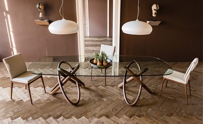 Carioca étkezőasztal. Olasz dizájn asztal 15 mm vastag áttetsző vagy extra áttetsző üveg asztallappal, diófa lábbal. Többféle méretben elérhető, amelyhez számos további stílusban hozzáillő termék is választható.