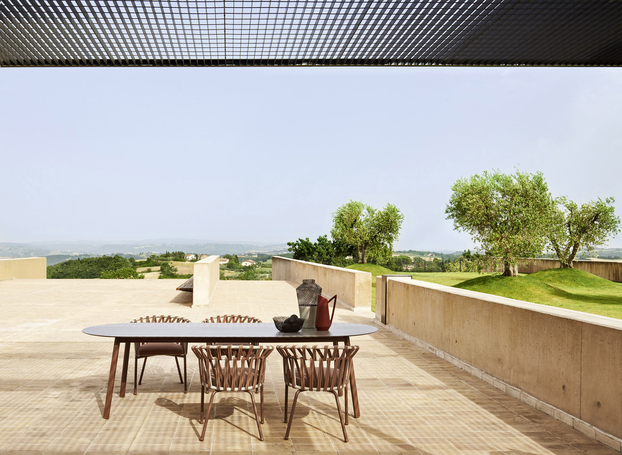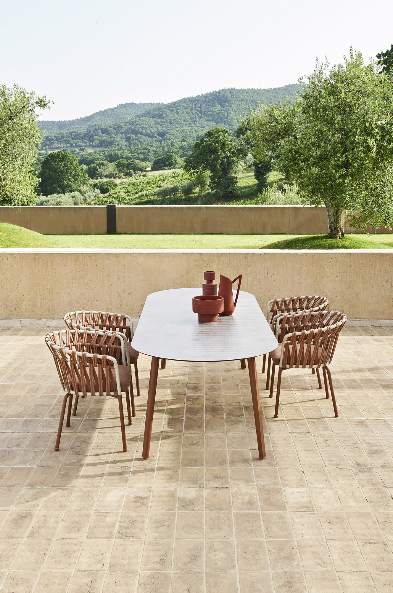 VAR. EM. stílusos formatervezésű dizájn étkezőasztal. Harmonikus karcsú lábszerkezet ad támaszt az ovális alakú asztallapnak. A Var. Em. kollekció termékei tökéletesek kertek és egyéb külterek hangulatos, esztétikus berendezésére.