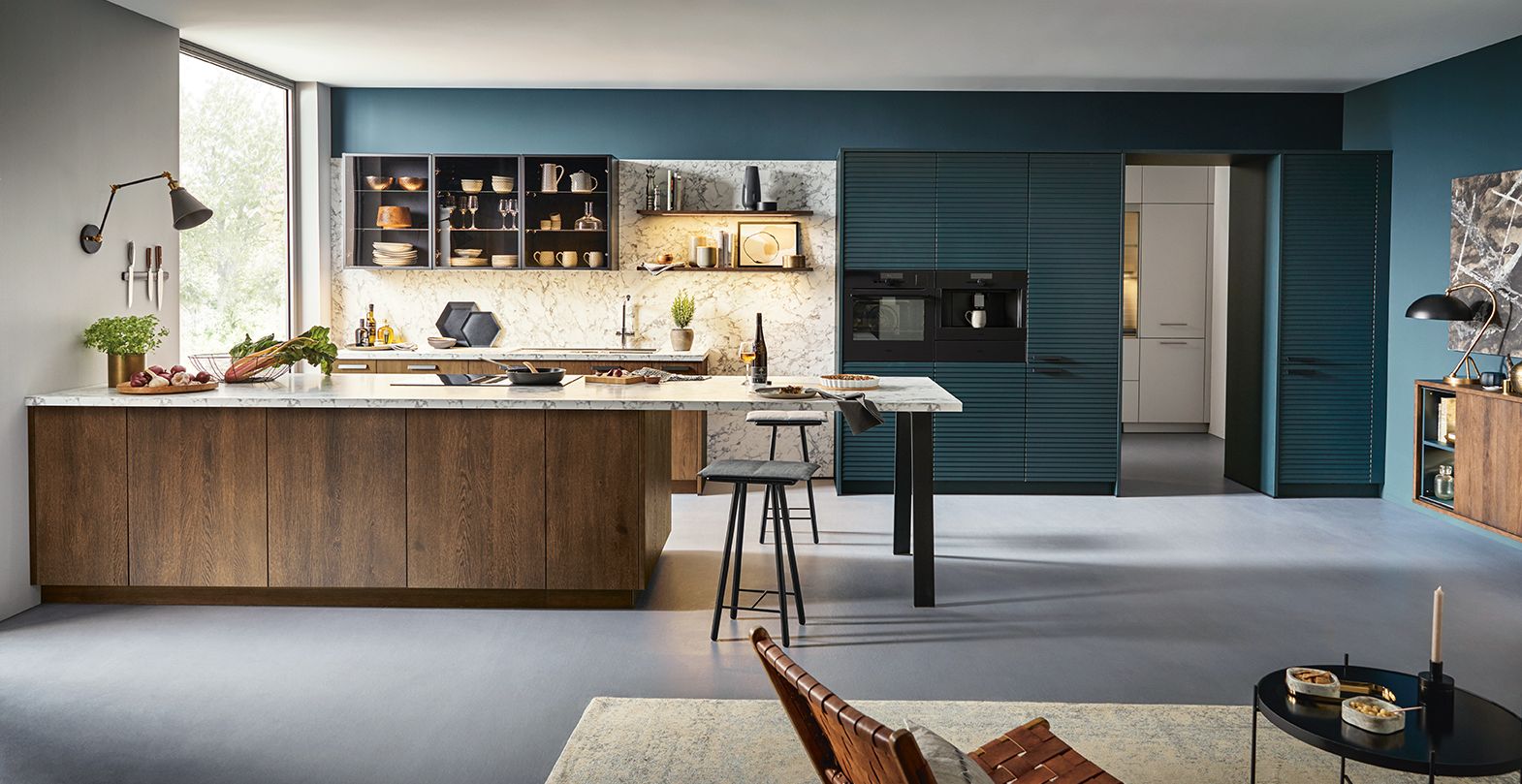 Ez a konyha minden érzékszerv számára örömet jelent. Szemet gyönörködtető felületek, a csomós tölgyfa dekor, a finom szemcsés márvány dekoráció és kiemelésként
