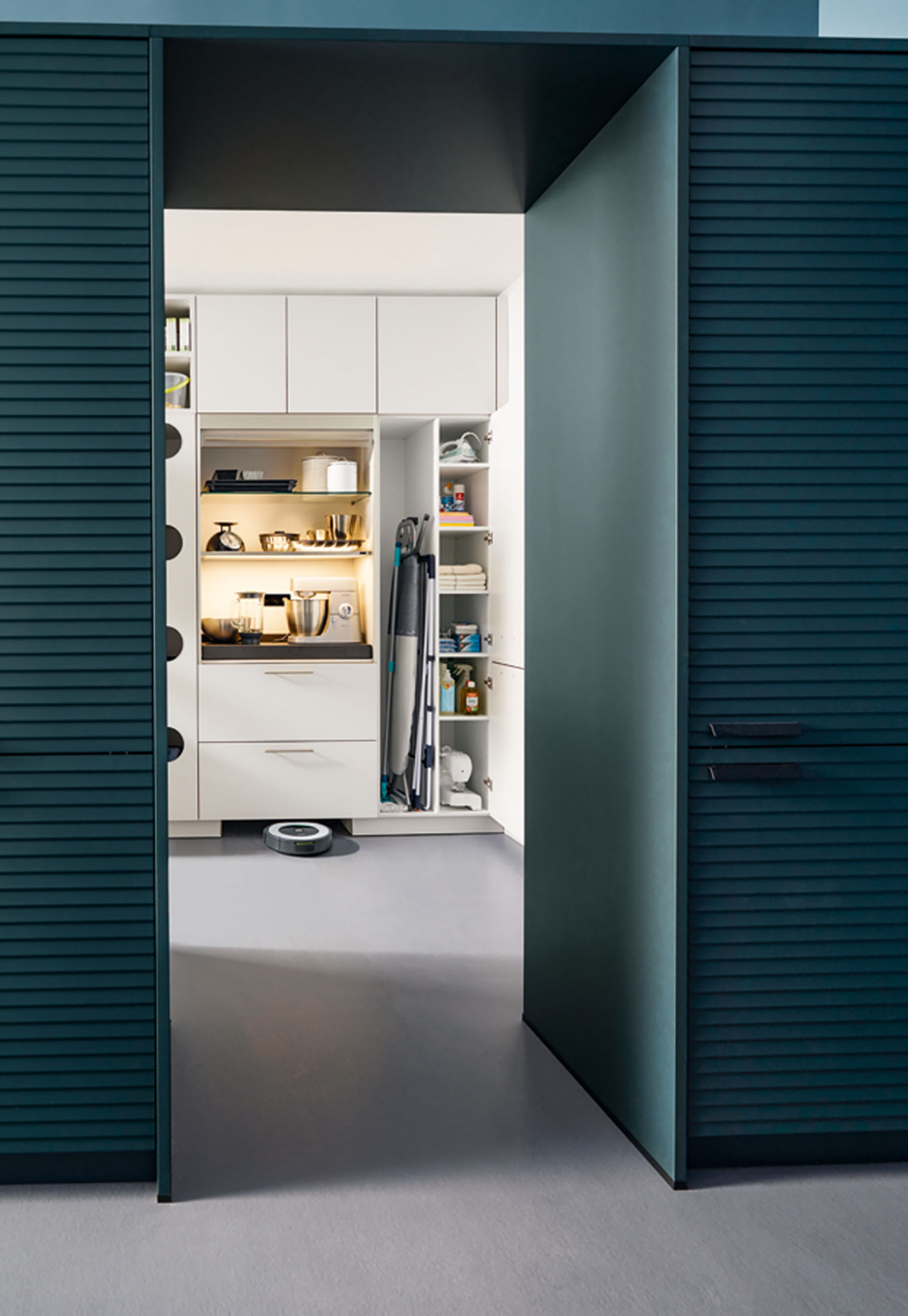 a tágas kihúzható részekben a főzőedények tökéletesen elférnek. Stílusos otthon poharak és étkészletek számára.  A robot porszívónak is van saját, integrált „garázsa”