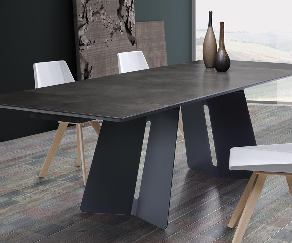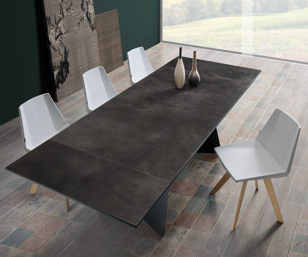 Nat. Koral olasz dizájn asztal. Könnyedén kiterjeszthető letisztult vonalvezetésű modern asztal. A fémből készült lábakhoz szatén üveg, vagy furnérozott faasztallap tartozik eredeti porcelán kőbevonattal.