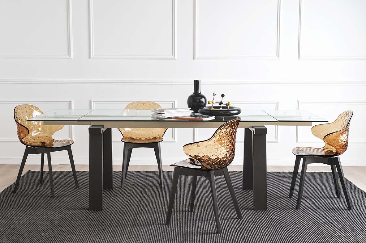 A Calligaris Levante étkezőasztal a modern olasz bútortervezés egyik legszebb példája, ahol a fa természetessége, a fém stabilitása és az üveg légies eleganciája találkozik. A Levante különlegessége abban rejlik, hogy a tömörfa lábak meleg tónusa és karakteres megjelenése finoman ellenpontozza a edzett üveg asztallap átlátszóságát, amely alatt a fém vezetősínek színjátékot adnak a konstrukciónak.
