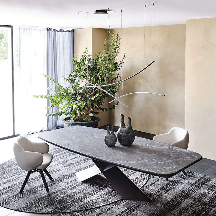 Cat. Tyron Keramik Premium étkezőasztal többféle méretben. Olasz dizájn asztal széles választékú matt, vagy fényezett felületű kerámia ill. fából készült asztallappal, valamint lakkozott acél lábszerkezettel. Többféle méretben bevonattal elérhető, amelyhez számos további stílusban hozzáillő termék is választható.