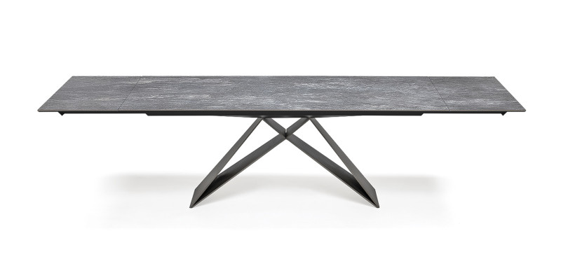 Választható típusú és mintázatú matt, vagy fényes kerámiából készített meghosszabbítható asztallap. A lábak titán, grafit, vagy fekete lakkozott acél változatban kaphatók.