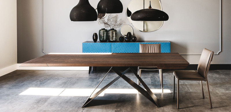 Választható tömör dió-, vagy tölgyfából készült meghosszabbítható asztallap. A lábak titán, grafit, vagy fekete lakkozott acél változatban kaphatók.