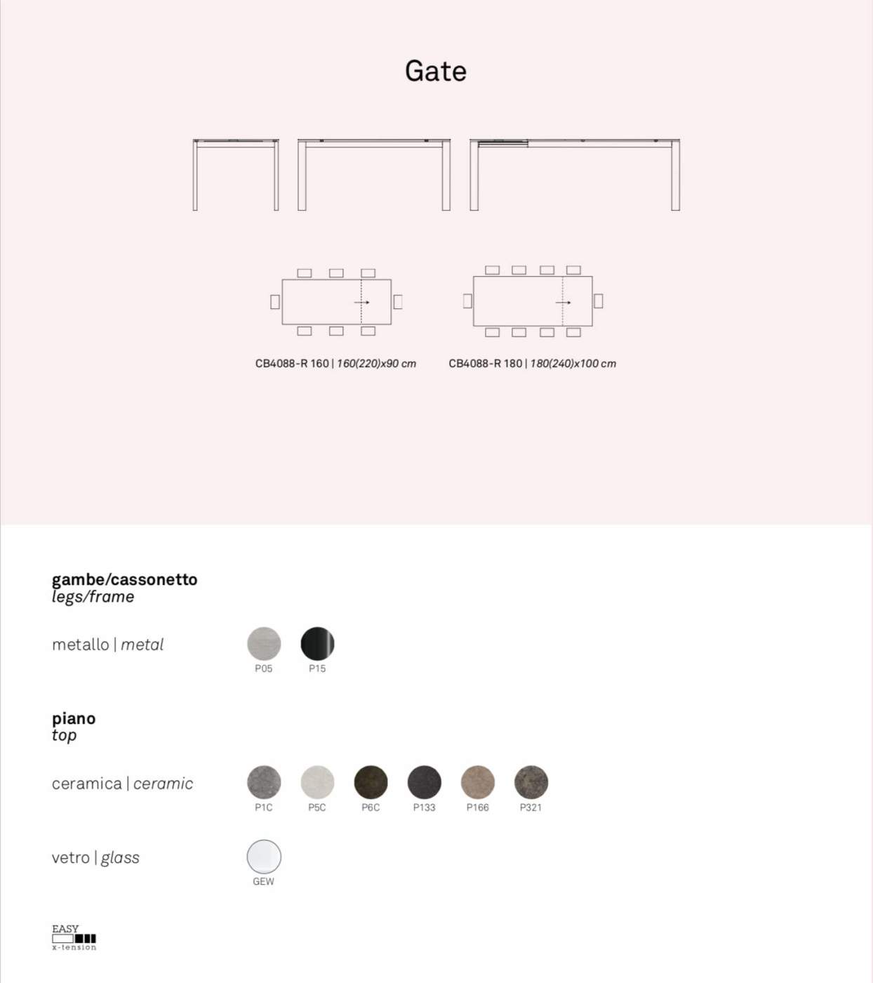 Con. Gate karakteres olasz dizájn asztal. Tömörfa kiterjeszthető asztallapjával és masszív fém lábszerkezetével esztétikus letisztult stílust sugároz, amivel számos helyiség funkcionális és mutatós darabja lehet. A meghosszabbításhoz szükséges utasítások a tartószerkezethez vannak szerelve. Mechanikájának köszönhetően a lábak mindig az asztal végén helyezkednek el az aktuális méretétől függetlenül. Többféle színárnyalatban és mintázatban elérhető, amelyhez számos további stílusban hozzáillő termék is választható.