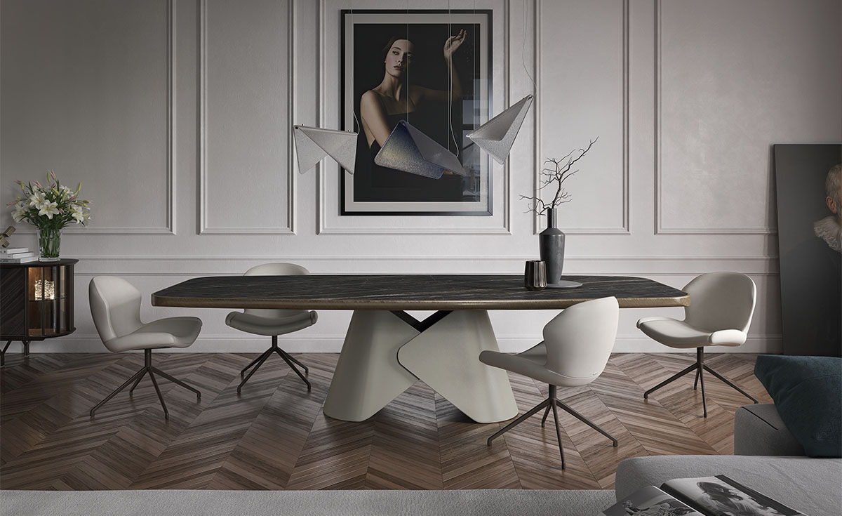 A Scott Keramik Premium szoborszerű formája lehetővé teszi, hogy az étkezőasztal ne csak praktikus bútor legyen, hanem egy vizuális központ a helyiségben. A réteges, ívelt talp és a masszív, mégis elegáns kerámia felsőlap kombinációja dinamikus játékot hoz létre a fényekkel és árnyékokkal, így az asztal minden szögből más karaktert mutat. Ez a részletekre való gondos odafigyelés és az anyagok magas minősége biztosítja, hogy az asztal hosszú éveken át megőrizze eleganciáját.