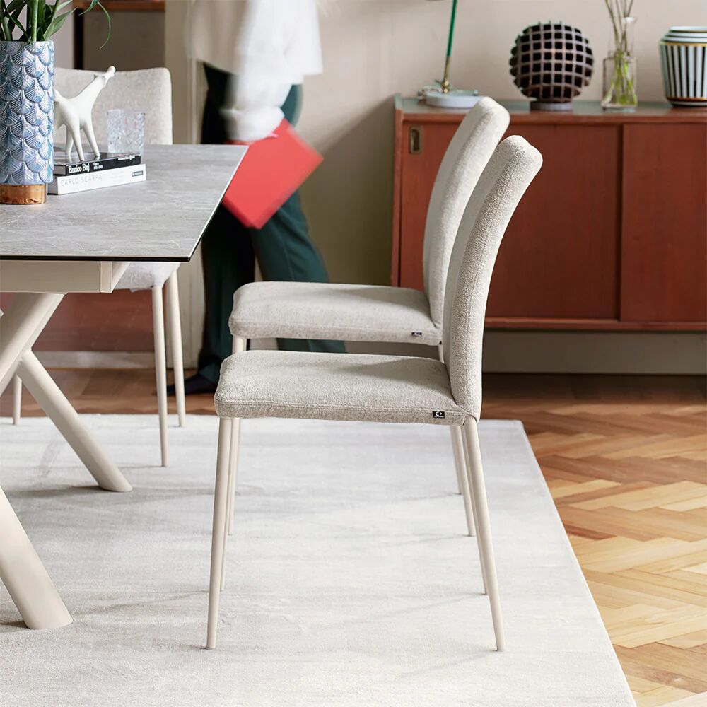 A kárpitozott ülőfelület és háttámla szövet vagy műbőr kivitelben is választható, így a szék könnyen igazítható az adott enteriőr stílusához. A szövetkárpit melegebb, otthonosabb hangulatot teremt, míg a műbőr változat elegánsabb, modern megjelenést biztosít, emellett praktikus és könnyen tisztítható felületet kínál. A többféle színválaszték lehetővé teszi, hogy a szék harmonikusan illeszkedjen az étkező többi bútorához vagy akár látványos design elemként jelenjen meg.