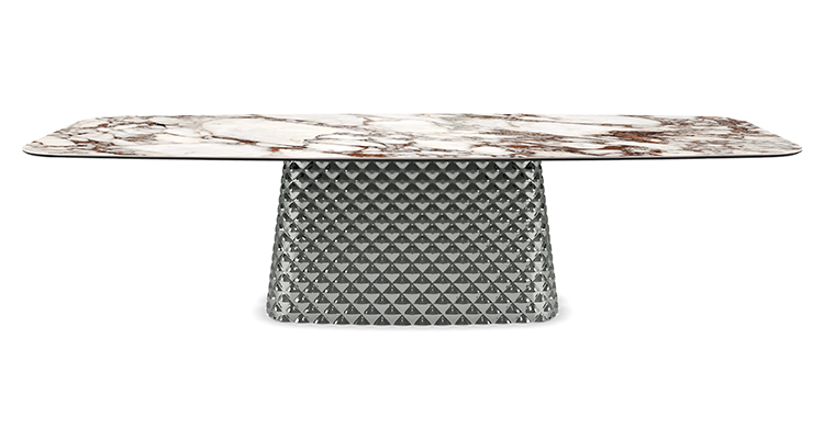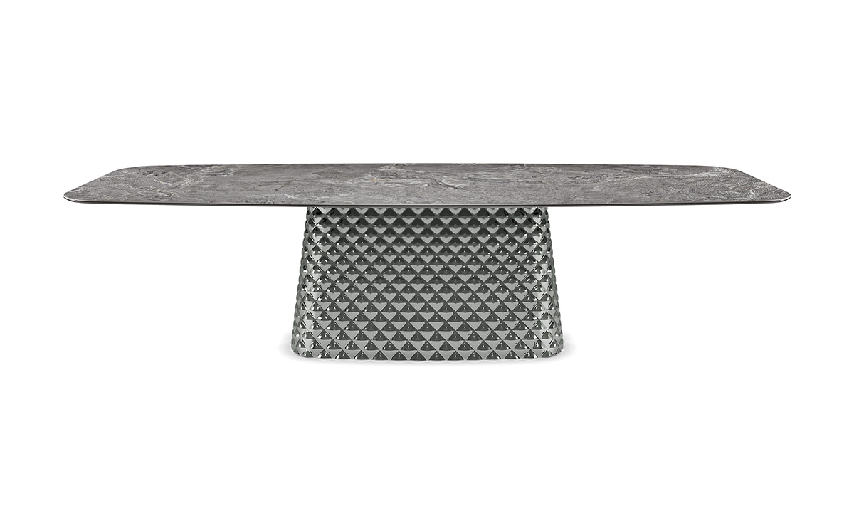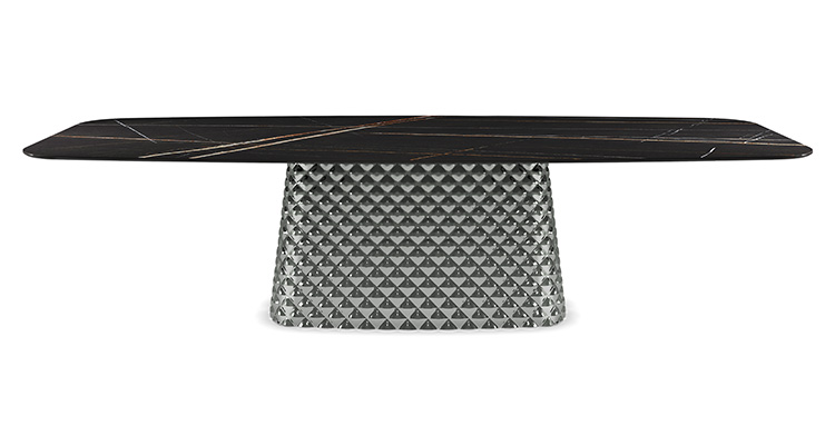 Olasz dizájn asztal szögletes, vagy lekerekített sarkú asztallappal, dekoratív, választható típusú és mintázatú kerámiából készítve. A tartószerkezet szintén többféle színből választható.