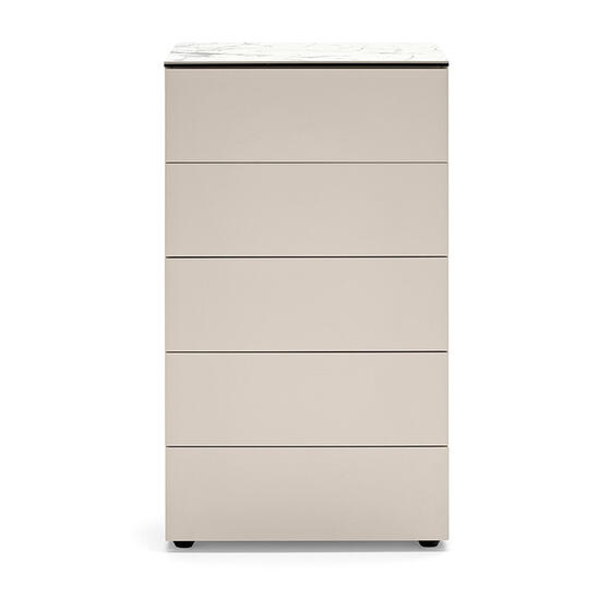 A komód fogantyú nélküli „push-pull” fióknyitó rendszerrel működik, amely biztosítja a modern, letisztult megjelenést és a halk, zökkenőmentes használatot. A öt tágas fiók elegendő helyet kínál ruhák, kiegészítők vagy egyéb személyes tárgyak rendszerezett tárolására. A stabil, precízen megmunkált szerkezet és a kiváló minőségű alapanyagok a Calligaris védjegyei, garantálva a hosszú élettartamot és a prémium érzetet.