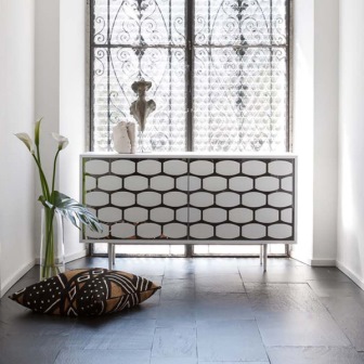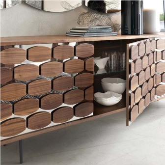 Tonin Casa Honey tálaló komód. Olasz modern tálaló komód az '50-es évek inspirálta dizájnnal, méhkaptárat idéző fa dekorációs elemekkel ellátva. Többféle színben elérhető, amelyhez számos további stílusban hozzáillő termék is választható.