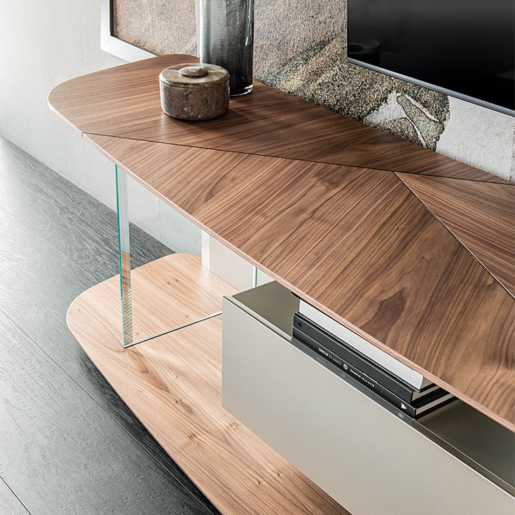 A legfeltűnőbb elem a fa felsőlap, amely a bútor karakterének igazi középpontja. A felsőlapot gondosan összeillesztett, egyenletes illesztések és kontrasztos fa betétek díszítik, kiemelve a geometriai harmóniát és a precíz kivitelezést. A felsőlap anyagválasztása, legyen az Canaletto dió vagy égetett tölgy, időtálló eleganciát kölcsönöz a komódnak, miközben meleg és otthonos hangulatot teremt a nappaliban.