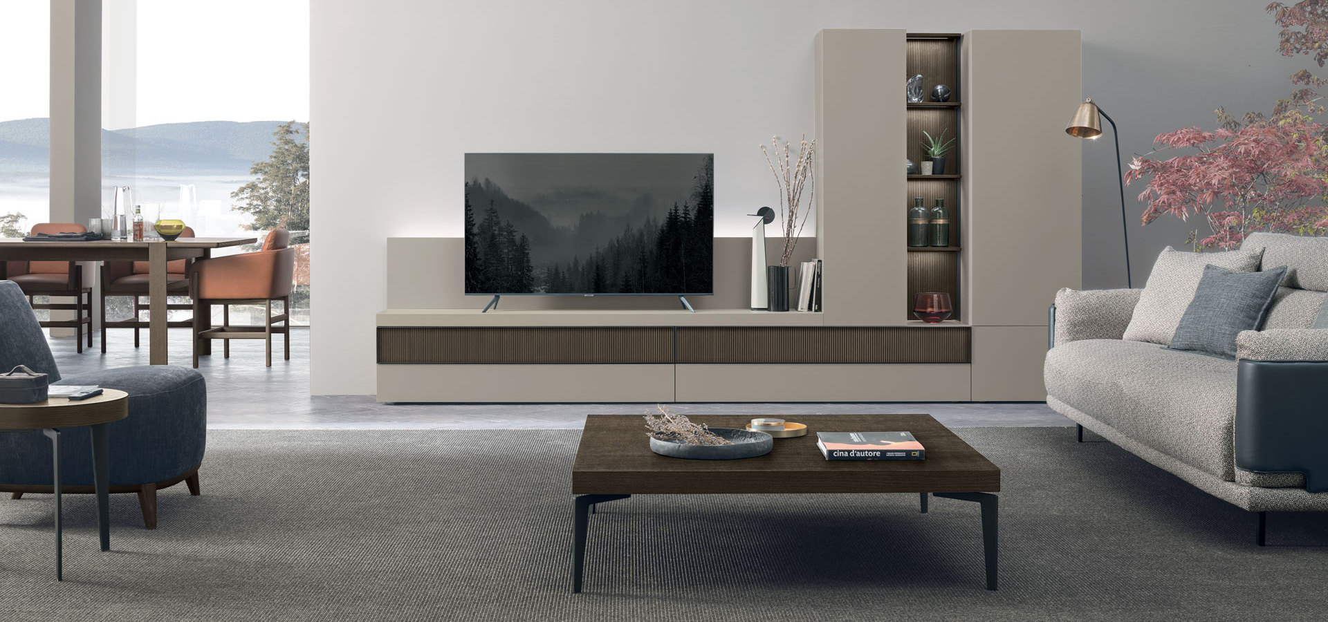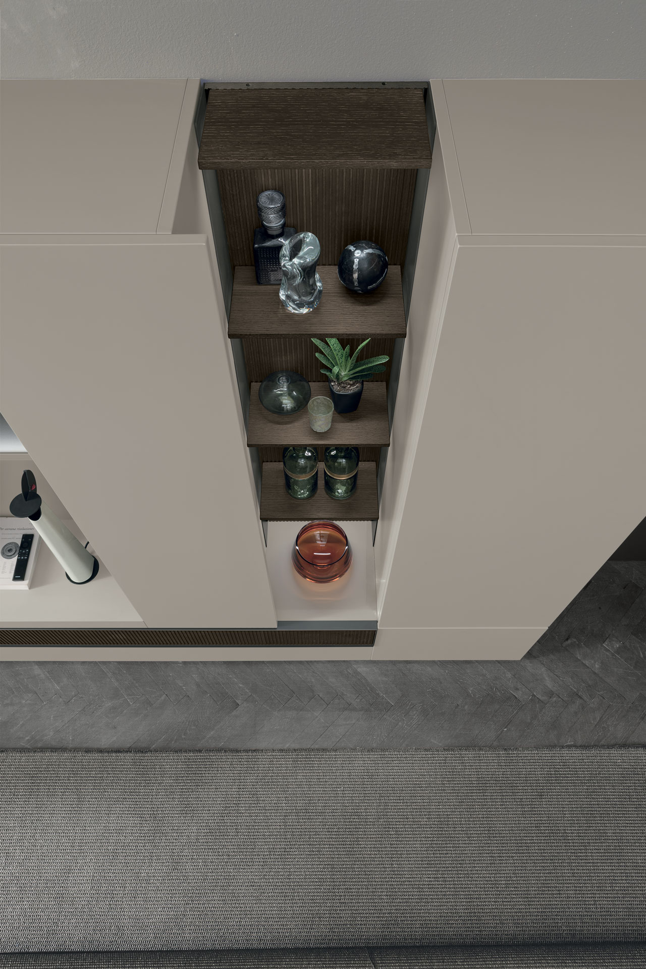 TMS. A110 elegáns olasz dizájn nappali összeállítás. A különböző textúrájú felületei izgalmas kompozícióba állnak össze szinte bármilyen nappali helyiségben, meghatározó stílusos darab válhat belőle.