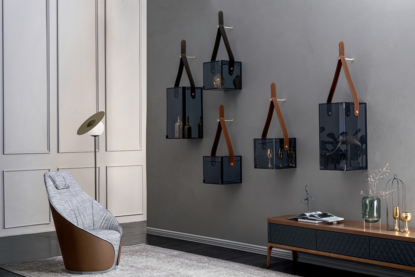 Ton. Chèri vitrin kétféle méretben és színben. Elegáns kristályüvegből készült falra rögzíthető vitrinpolc. A hátulsó felület belseje tükröződő felületű és a rögzítéshez használt szíj bőranyagból készül.