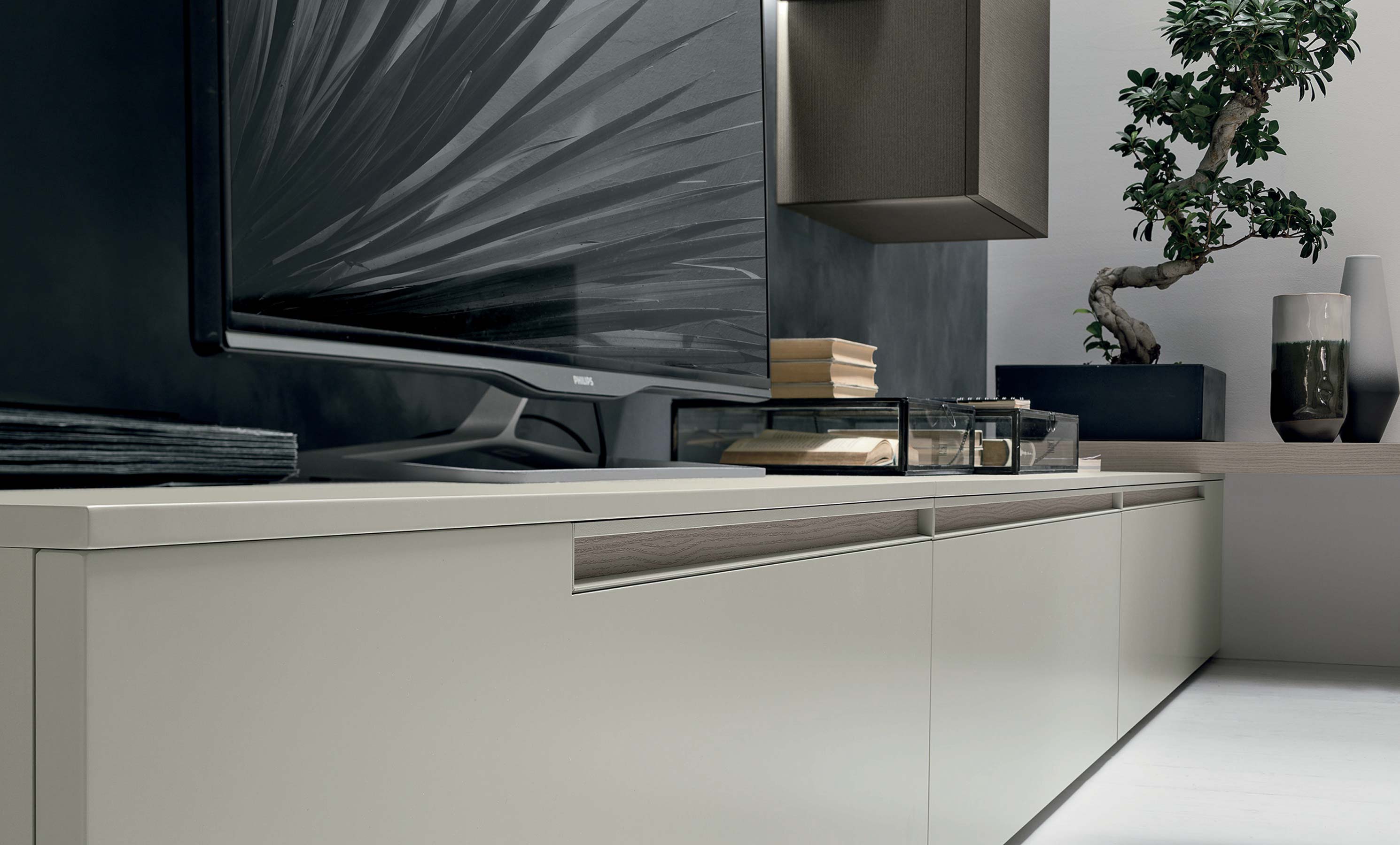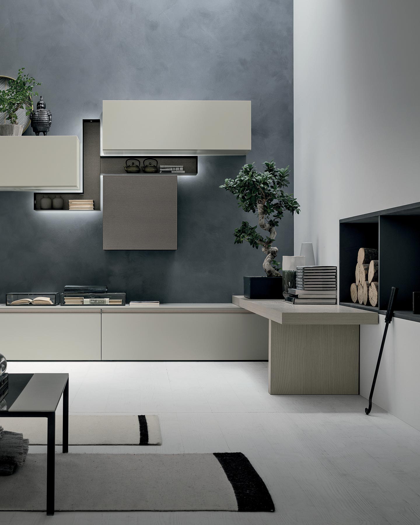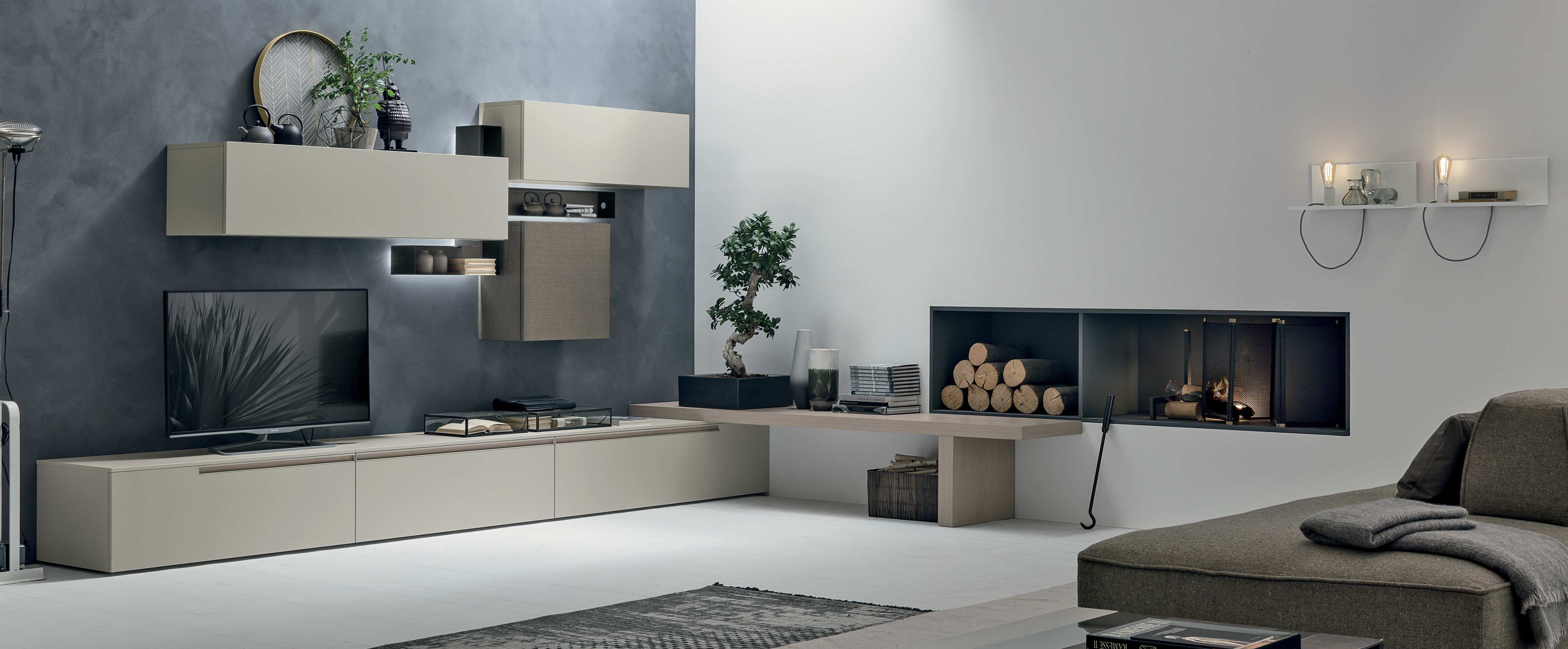 TMS. A128 elegáns olasz dizájn nappali összeállítás. Modern stílusú polcrendszer esztétikus fénylő hátpanelekkel.