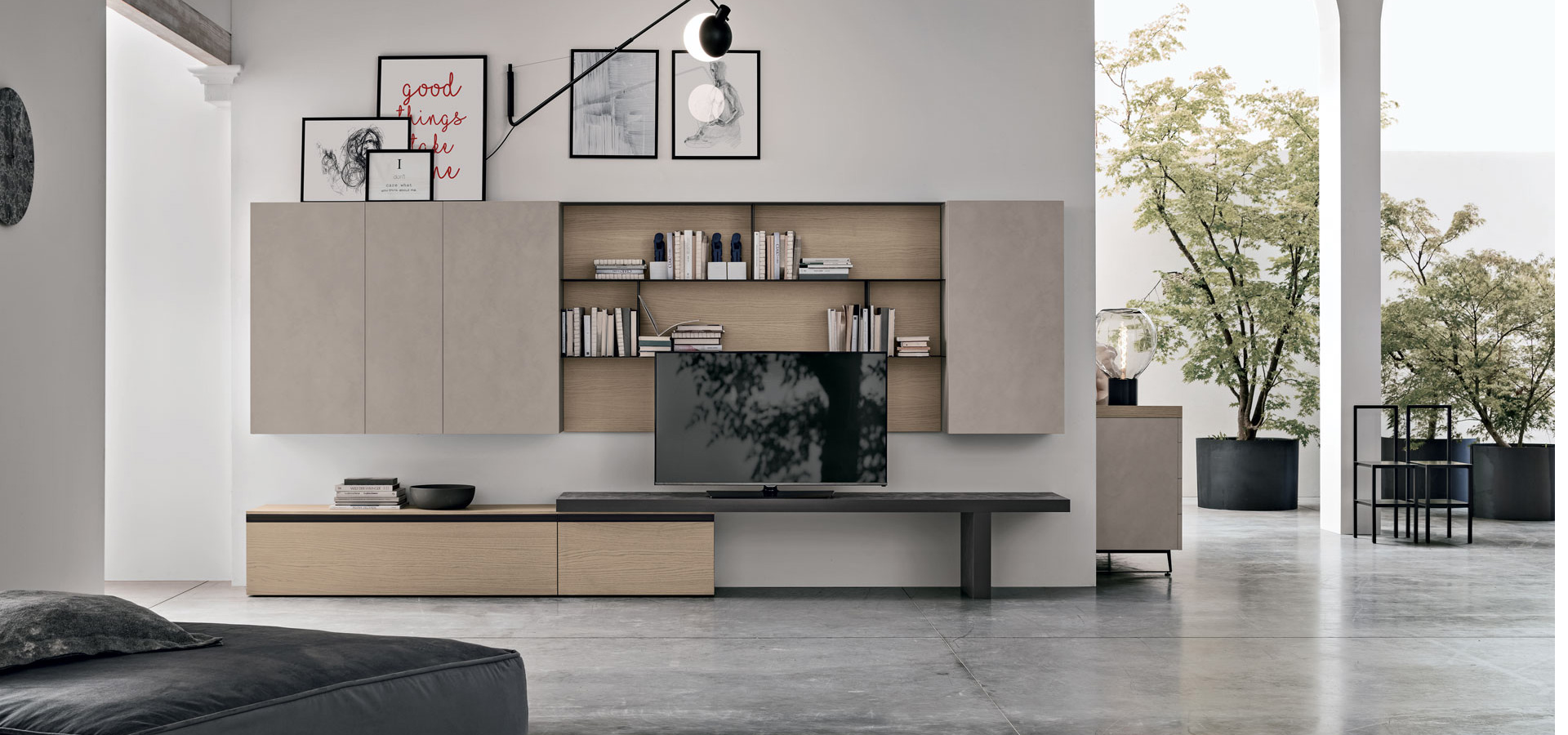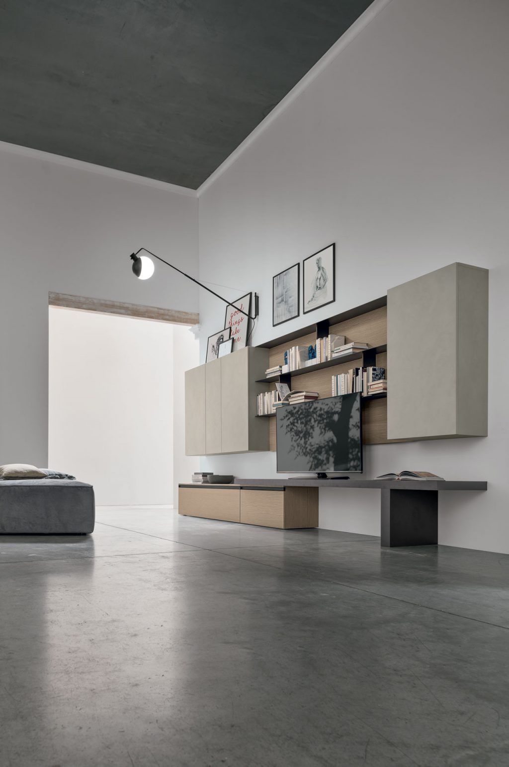 TMS. A122 elegáns olasz dizájn nappali összeállítás. Légies megjelenésű eredeti polcrendszer, melyből nappalijában meghatározó stílusos darab válhat. Különböző textúrájú felületekkel kapható.