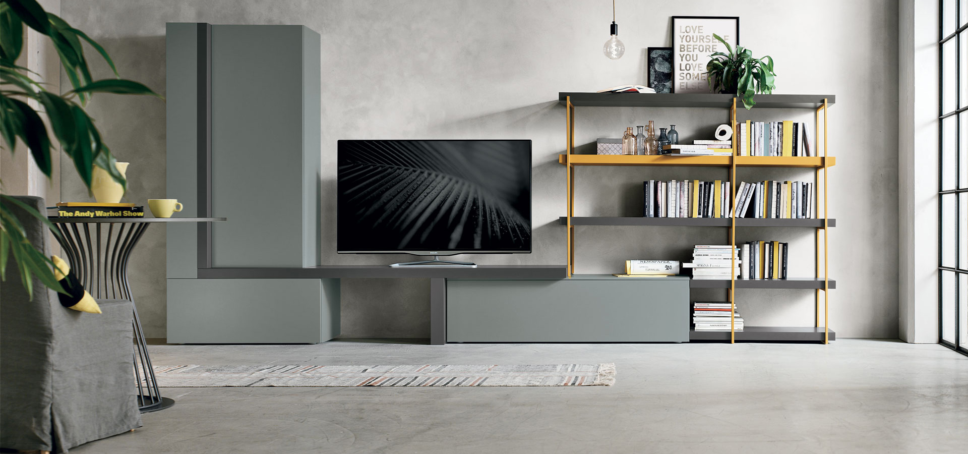 TMS. A136 elegáns olasz dizájn nappali összeállítás. Légies megjelenésű eredeti polcrendszer, mely magára vonja bármely helyiségben a tekintet. A különböző textúrájú felületei izgalmas kompozícióba állnak össze szinte bármilyen nappali helyiségben.