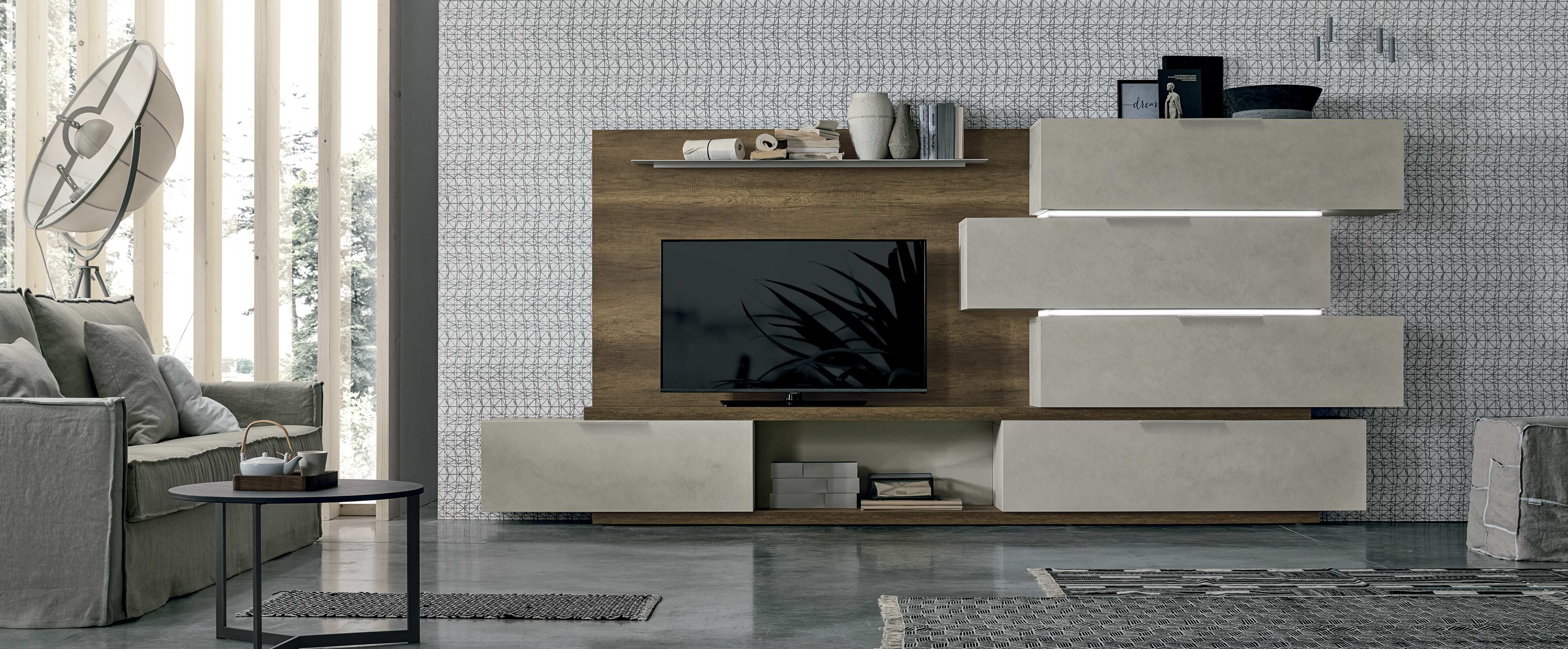 TMS. S005 elegáns olasz dizájn nappali összeállítás. A szekrény modulok egymásra helyezhető különböző elrendezésekben. közöttük LED-es világító elem található, mely kimagaslóan esztétikussá teszi a minimalista modern formatervezésű polcrendszert. Különböző textúrájú felületekkel kapható.