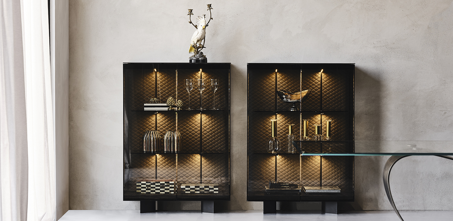 Cat. Boutique Alta üvegvitrin LED megvilágítással belső üvegpolcokkal. Elegáns acélból készült struktúrája mellett lenyűgöző árnyalatú üvegajtók tartoznak, valamint a hátsó felületen belül esztétikus bőrborítás.